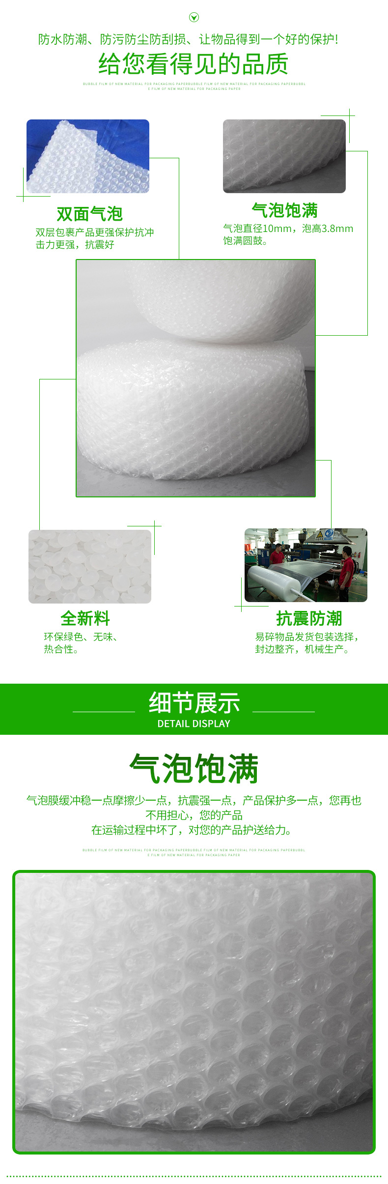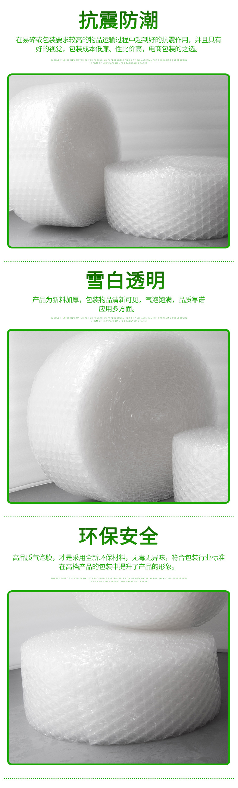采用聚乙稀PE原料,經(jīng)擠出雙層膜真空復(fù)合成型的氣墊薄膜(簡稱氣泡膜),產(chǎn)品主要用于儀表、儀器、易碎、易損物品的防震包裝及電子行業(yè)、食品、工藝品、五金、注塑件、日用品等行業(yè)的減震包裝,可生產(chǎn)單面、雙面氣泡卷材、成型袋,小泡φ5MM,普通中泡φ8MM,并可生產(chǎn)達 φ30MM的超大氣泡膜,可生產(chǎn)防靜電氣泡袋,復(fù)合多種膜料的氣泡墊,以上產(chǎn)品均可著色。氣泡卷、氣泡膜、單面氣泡袋、雙面氣泡袋、加厚氣泡袋、紅色氣泡袋、白色氣泡袋、防靜電氣泡袋。